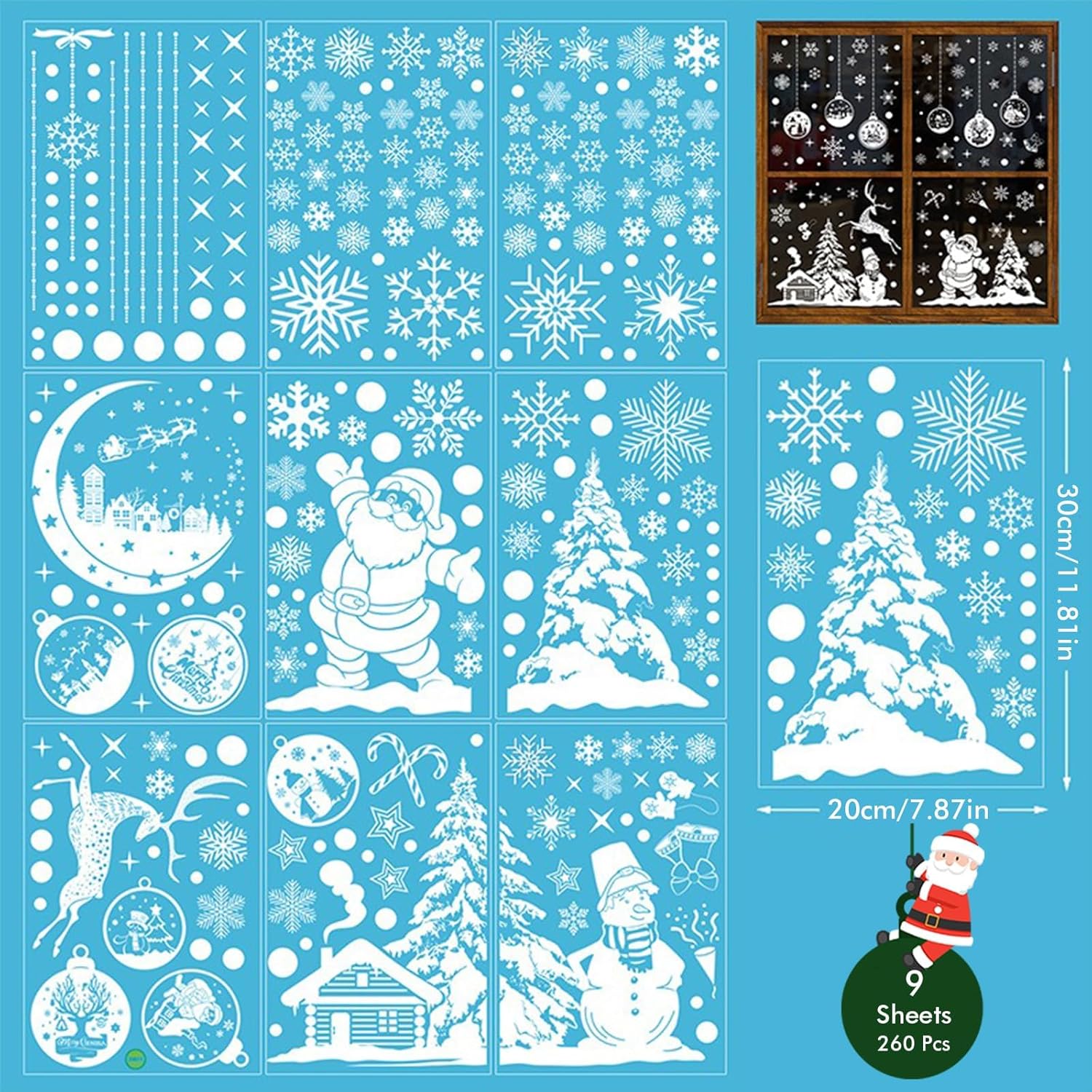 ❄9 Sheets Christmas Window Stickers❄ You will receive 9 sheets Cheerful Xmas window clings with a total of 260 classic Christmas patterns in different sizes like snowflakes, Santa Claus, Reindeer, Christmas tree, baubles, etc. Christmas-themed patterns can beautifully decorate your windows, mirrors and door, making a winter snow scene in your house.
