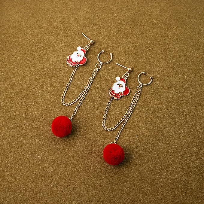 Generic Name : El Regalo Christmas Cuff Chain Earrings with Red Pom Pom for Girls & Women | Cute Xmas Tree / Wreath / Santa Stud Earrings with Ear Clip Tassel Dangle