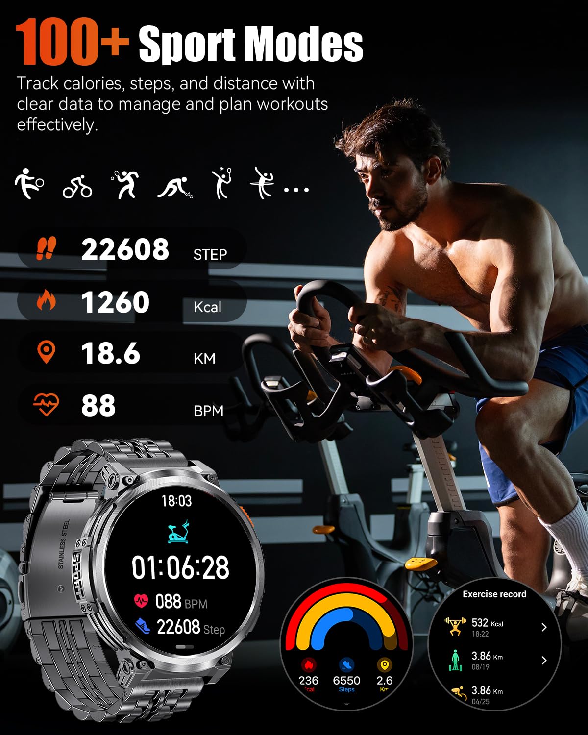 【Military-Grade Durability & IP68 Waterproof】Built for tough environments, this smartwatch features a military-grade composite and metal case, passing impact, temperature, and more tests. The high-strength tempered glass screen resists damage during activities. With IP68 waterproofing, it’s resistant to water, dust, and sweat, ensuring reliable performance in rain, handwashing, or daily activities. Please note, it is suitable for everyday water exposure like rain or handwashing, but swimming is not recommended.