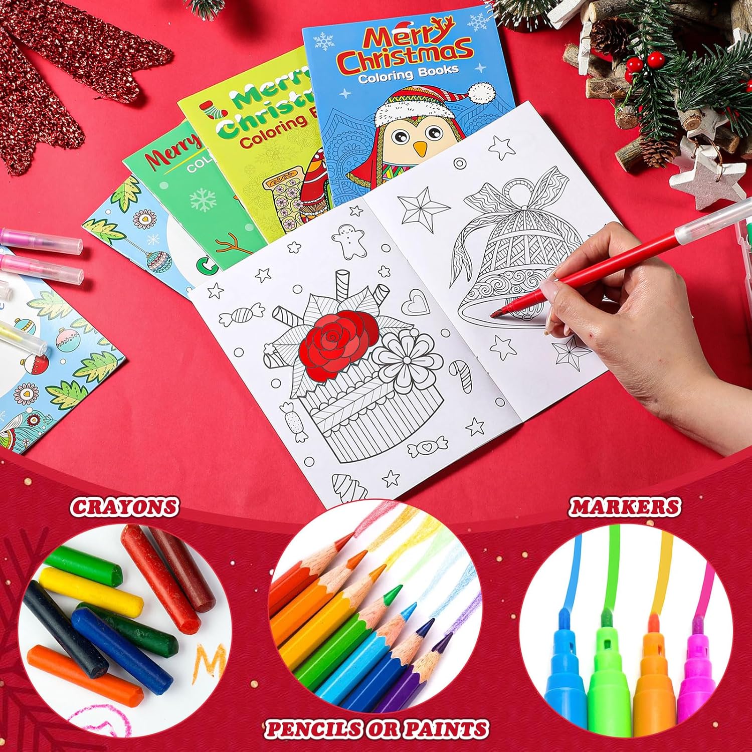 The package includes an array of Xmas coloring books for adults and children of different age groups, so no one feels left out during family coloring sessions.