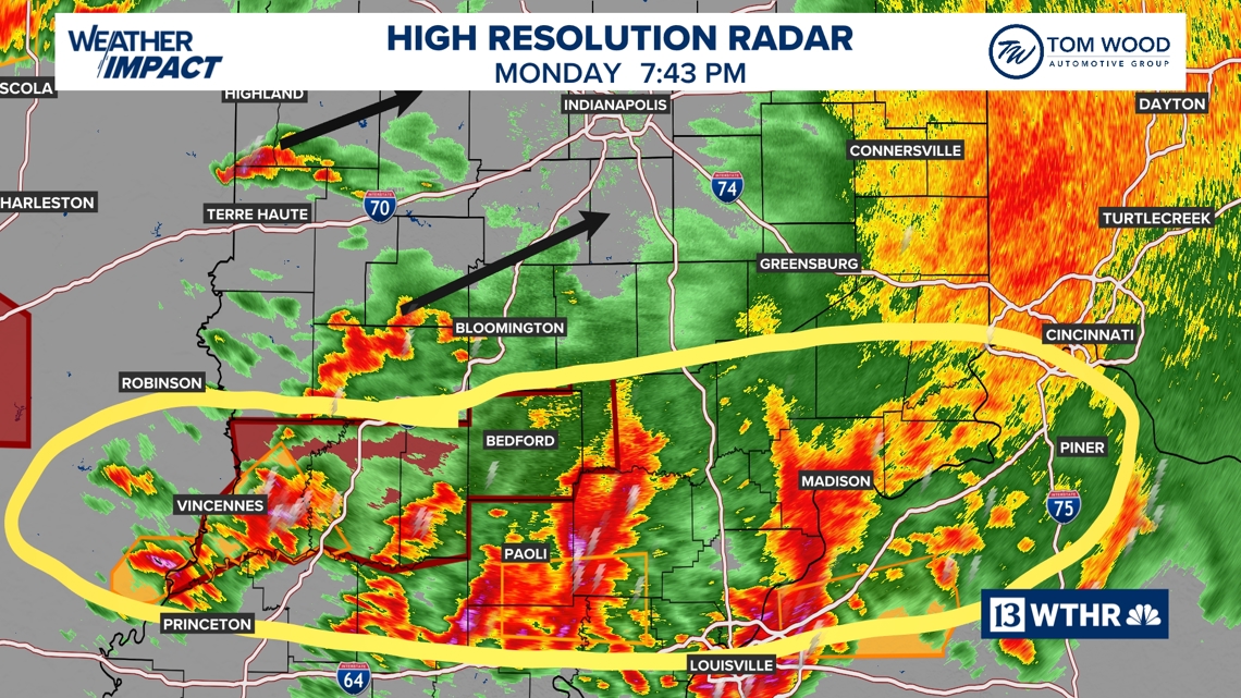 Rain/storms continue most of the evening along the I-70 corridor, but the focus for severe wind/rotation shifts to southwestern Indiana on the southern side of the storm line.
